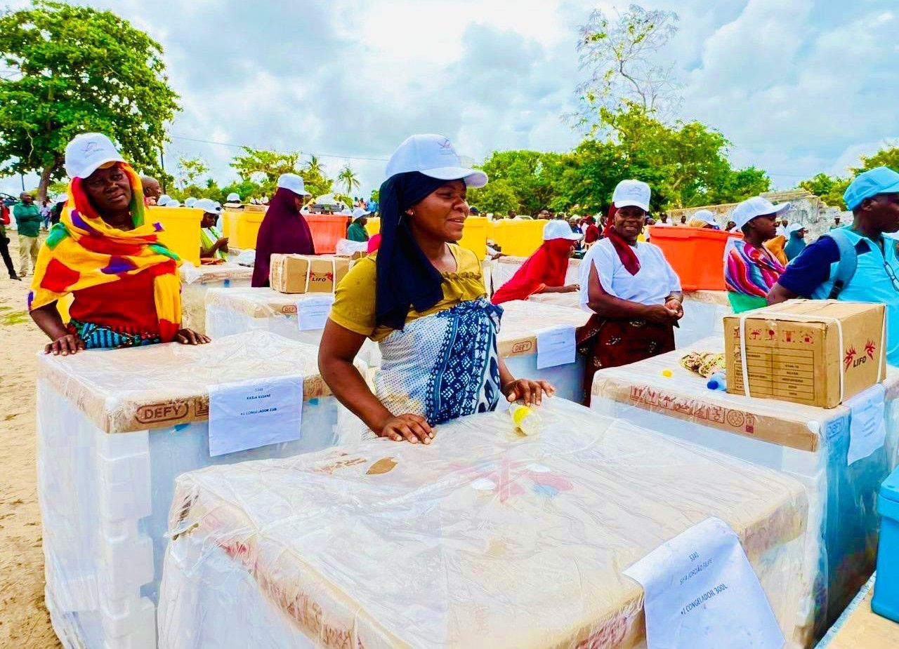 Sessenta e oito beneficiárias do programa MaisPeixe Sustentável, implementado pelo Fundo de Desenvolvimento da Economia Azul (ProAzul), recebem kits de trabalho da cadeia de valor da pesca artesanal na província de Manica.