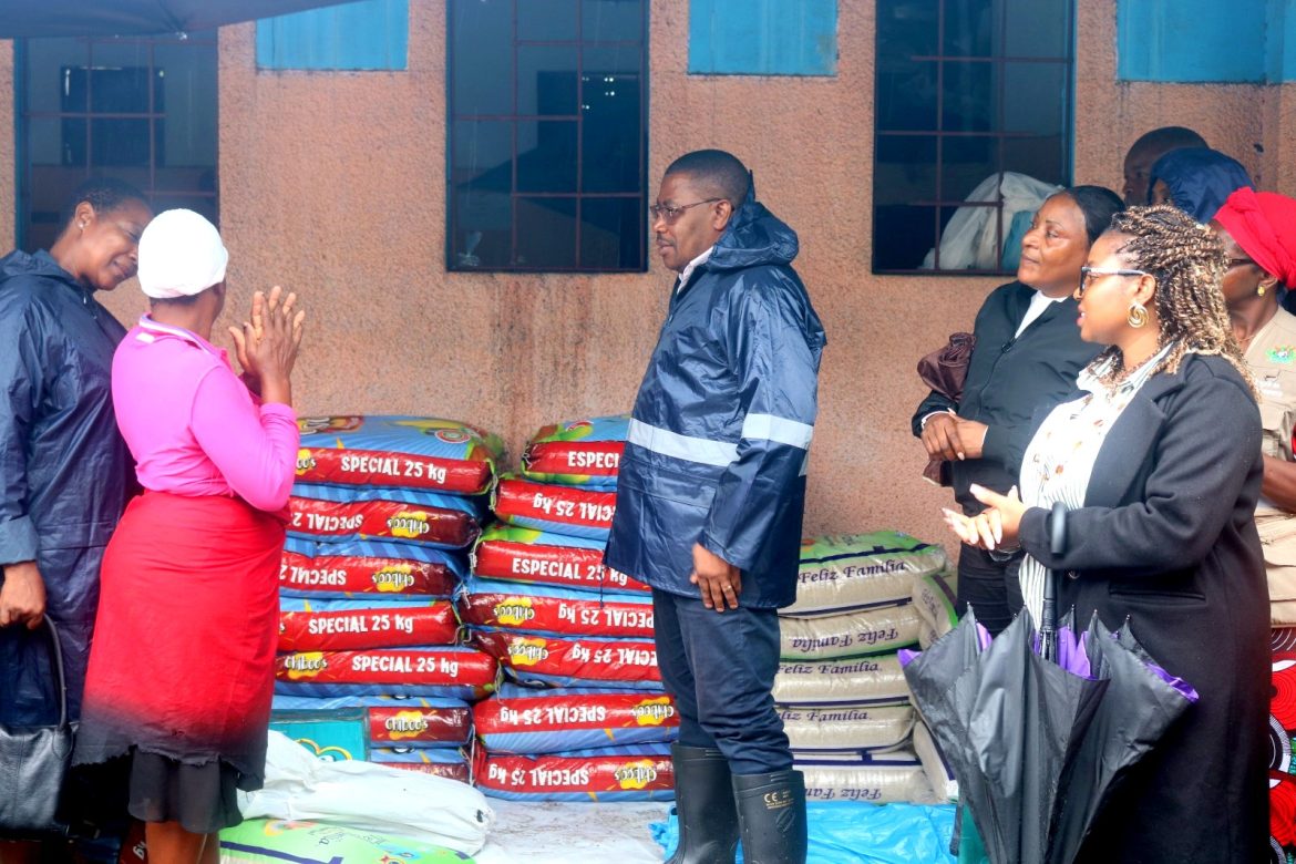 O secretário de Estado na Cidade de Maputo, Vicente Joaquim, entrega hoje diversos produtos alimentares à população assolada pelas inundações e cheias no bairro 25 de Junho B.